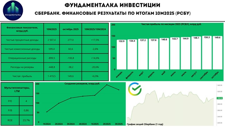 Сбербанк сильно отчитался за октябрь и 10 месяцев 2025 года по РСБУ. Пройдемся по ключевым моментам: