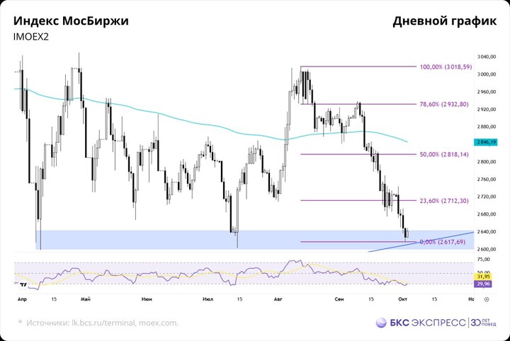 Фондовый рынок РФ замедляет снижение после затянувшегося периода нисходящего движения. Многие бумаги перепроданы по сигналам осцилляторов и находятся у поддержки, как и непосредственно Индекс МосБиржи. Рассмотрим технические цели отскока по бенчмарку и тяжеловесным бумагам российского рынка.