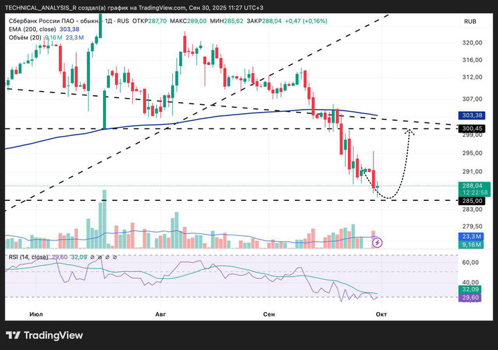 Сбербанк по-прежнему под давлением: цена закрепилась ниже 300 и торгуется в зоне снижения. RSI остаётся у отметки 30, сигнализируя перепроданность, но разворот пока не подтверждается. Ближайшая поддержка — блок 280-285. Пока она держится, сохраняется шанс на локальный отскок.