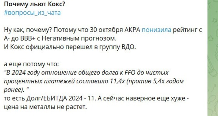 В тему анализа облигаций - вижу в одном из профильных каналов вопрос - почему льют облигации Кокса и ответ, что потому что АКРА понизила им рейтинг (и в общении с инвесторами тоже скорее советовал от таких облигаций избавляться)