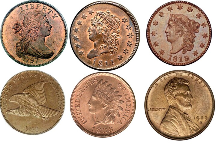 Первые официальные американские пенни были отчеканены в 1793 году из меди и назывались "Flowing Hair Cent".